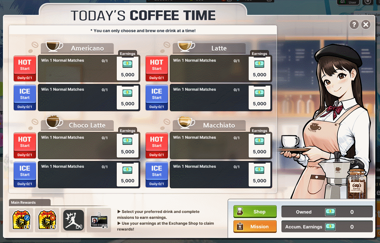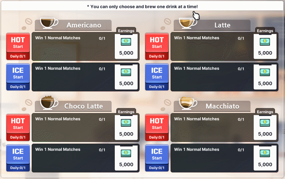 [1] Click [Start Brewing] on the menu board to pick your drink and start a mission
