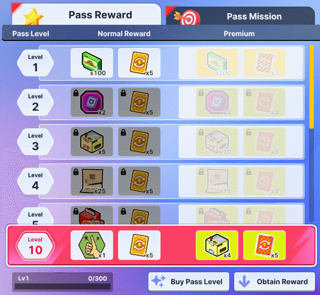 → Normal Rewards unlock as you gain EXP in every Pass Level.