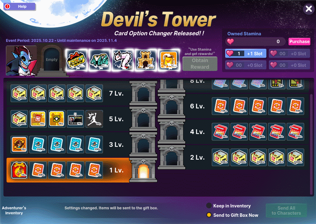 [Devil’s Tower Adventurer’s Inventory Item Distribution Screen]