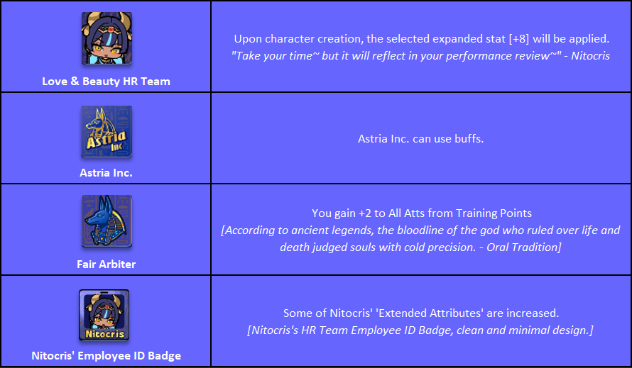 → Nitocris' Employee ID Badge: Some of Nitocris's 'Extended Attributes' are