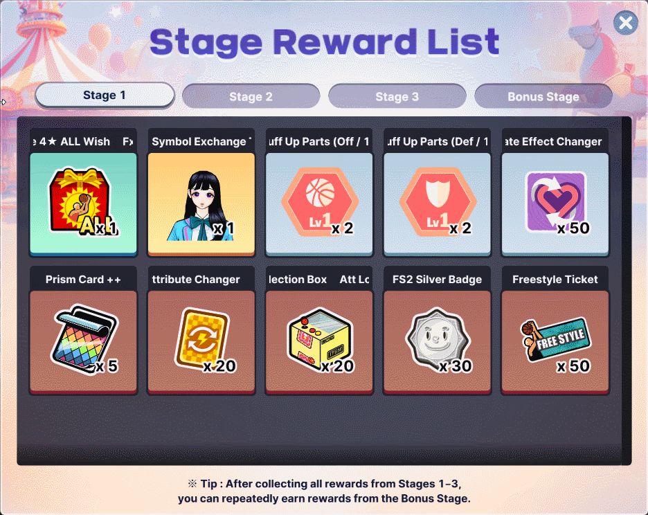 Tip: Bonus Stage rewards can be earned repeatedly after collecting all rewards