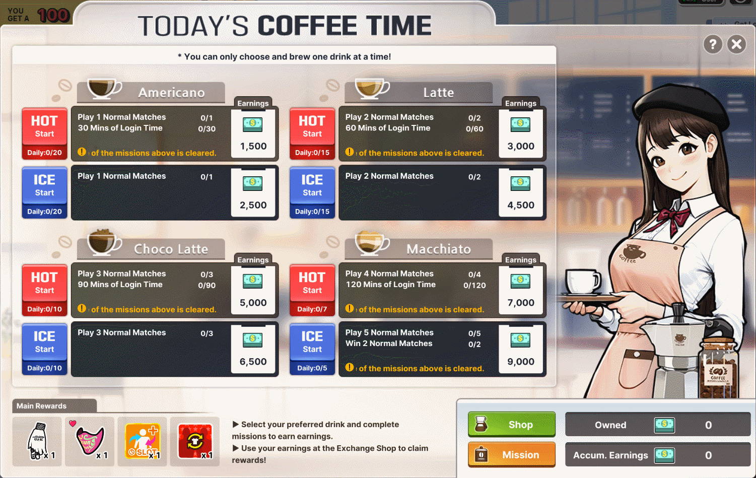 ~ Select your preferred drink and complete missions to earn earnings.