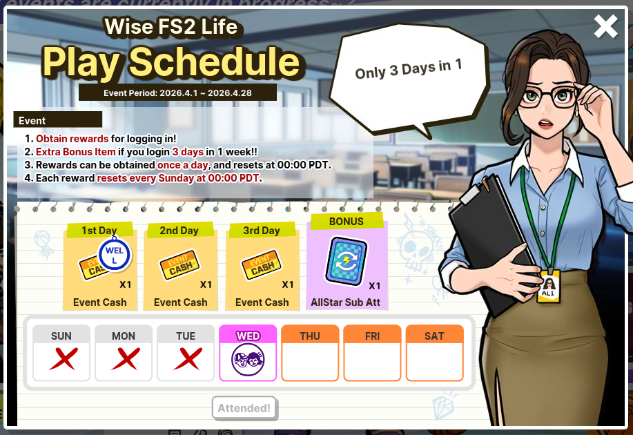 EVENTS HOME NEWS EVENTS Returning User Special Event! NO.19698 | Date: 2026-04-01 06:21:47 Returning User Special Event! Don’t miss out on awesome rewards just for logging in! Join the game each week to claim daily prizes and earn an extra bonus when you log in for 3 days within the week! Event Period: 2026/04/01 ~ 04/28 23:59 (PDT) [1] Obtain rewards for logging in! [2] Extra Bonus Item if you login 3 days in 1 week!! [3] Rewards can be obtained once a day, and resets at 00:00 (Server Time). [4] Each reward resets every Sunday at 00:00 (Server Time). [Returnee-Only Weekly Login Event Missions and Rewards List] Note: > This event is only available to accounts that returned after the update (2026.04.01). > Don’t miss out on these limited-time rewards—just show up and play! ================================================= Don’t miss your chance to grab these comeback rewards and keep the momentum going! Thank you for your continued support. - FreeStyle2 Team April Fools' Sudden Event! Premium Marathon LIST