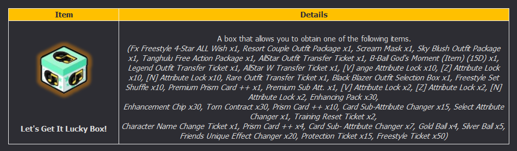 Let's Get It Lucky Box Item List: