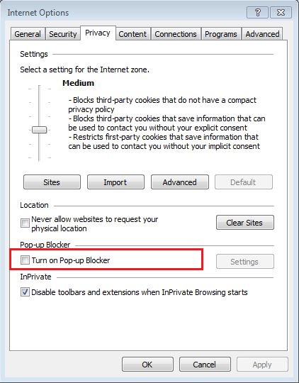 2. Go to Privacy Tab and Disable “Turn on Pop-up Blocker”